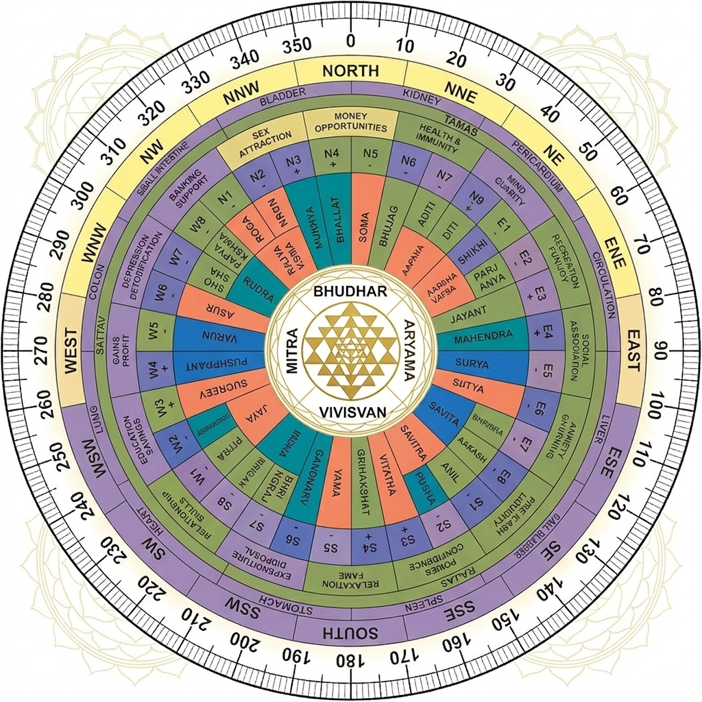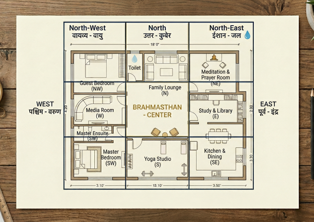 This grid divides your space into different zones, each linked to a direction, a natural element, and an aspect of life like health, wealth, or relationships. A Vastu practitioner reads this like a map β€” spotting where energy might feel stuck, too strong, or missing β€” and suggests simple changes to bring things back into balance.