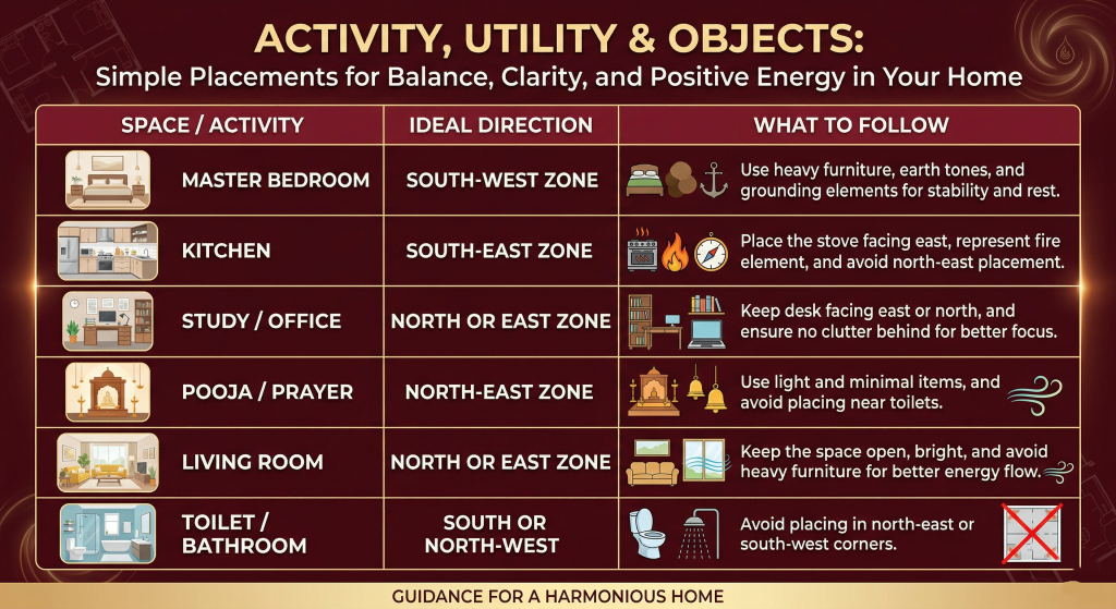 The North-East and East zones promote clarity, concentration, and learning. These directions are ideal for study rooms or workspaces.Facing East or North while studying enhances focus and productivity, while keeping the space clean and well-lit improves mental flow.