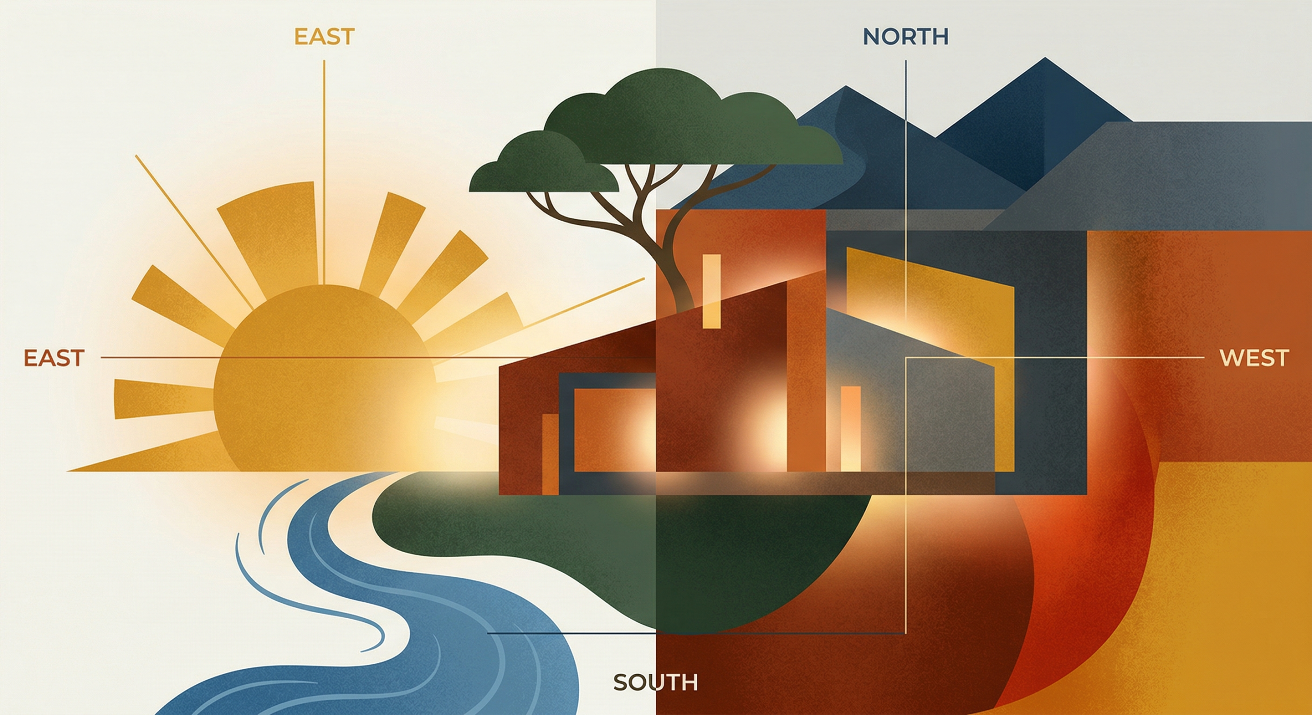Vastu is not superstition. It is spatial intelligence β€” the same intelligence that places the sun in the east, that draws rivers south, that grounds mountains in the north. We simply bring that same order into the places where you live and work.