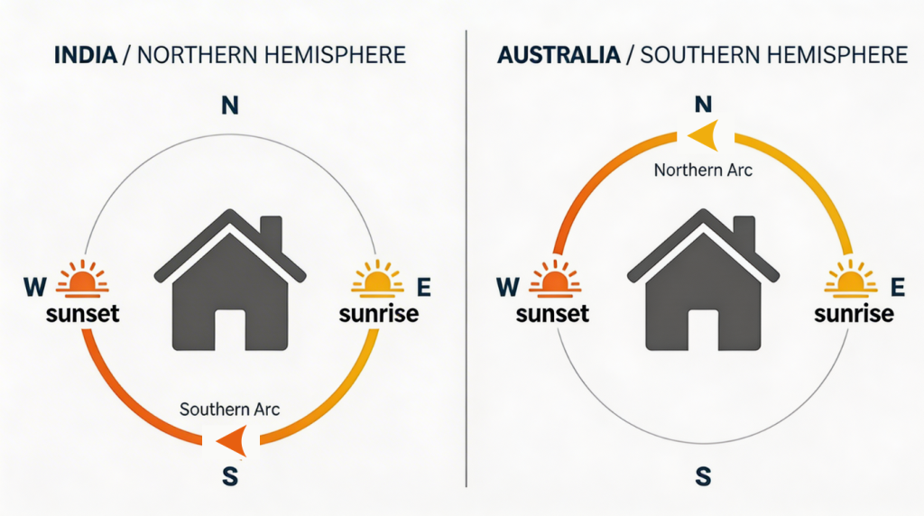 In Australia, that flips completely. The sun still rises in the east and sets in the west, but instead of arcing through the southern sky like in India, it travels through the northern sky here. This means your north-facing side gets the strongest sunlight all day, making north the fire zone and south the cooler, shaded side. So that southeast kitchen placement that works perfectly in India? In Sydney, that same corner sits in the shade. Applying Indian directional rules without adjusting for this shift puts everything in the wrong energetic position, and most of the time you won’t even know why the space feels off.